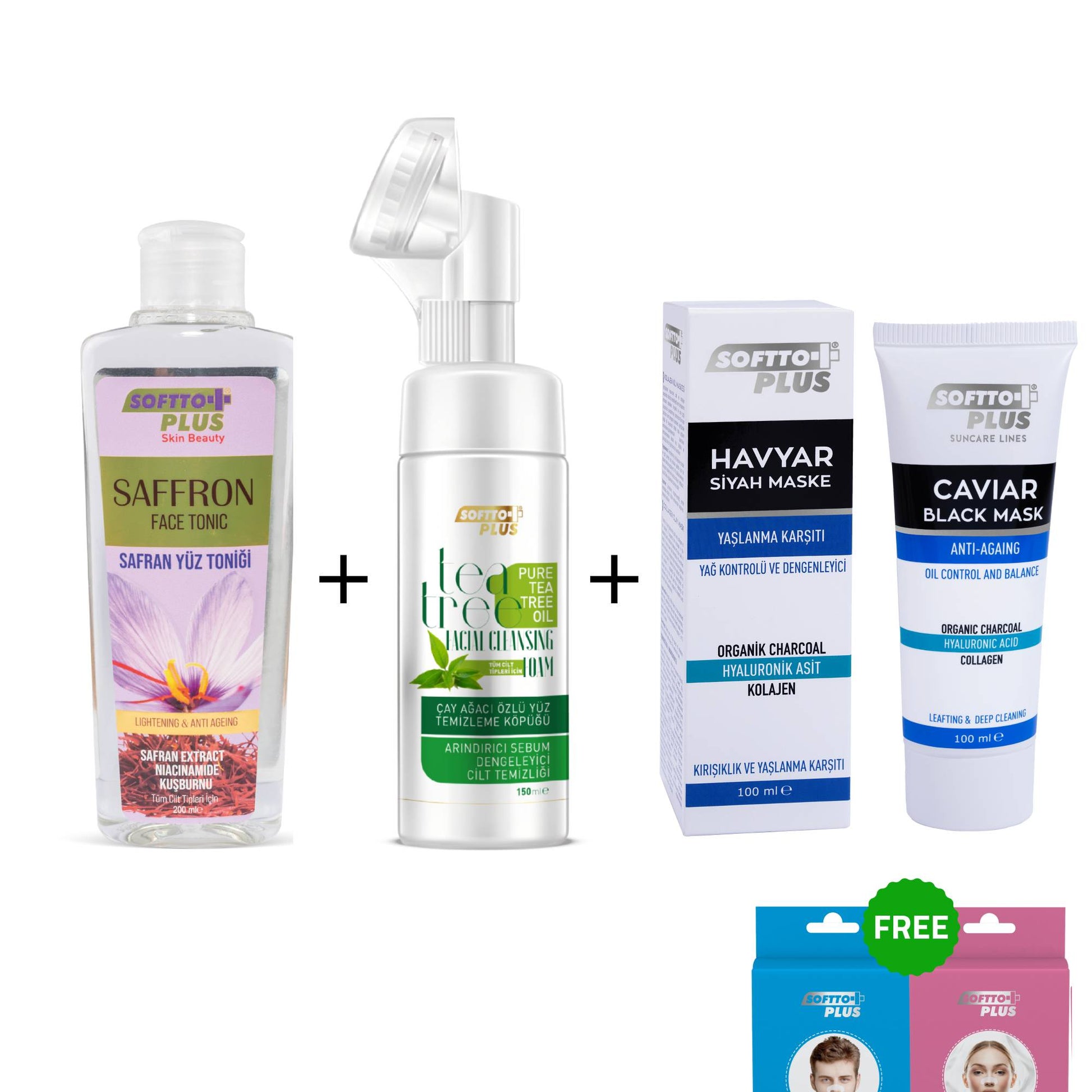 (Tonic Facial Cu Șofran - 200 ml + Spumă de Curățare Facială cu Arbore de Ceai + Mască Neagră Cu Caviar Anti-Îmbătrânire, Control Al Sebumului Și Echilibrare – 100 ml + 1 bandă nazală pentru femei sau bărbați – cadou)